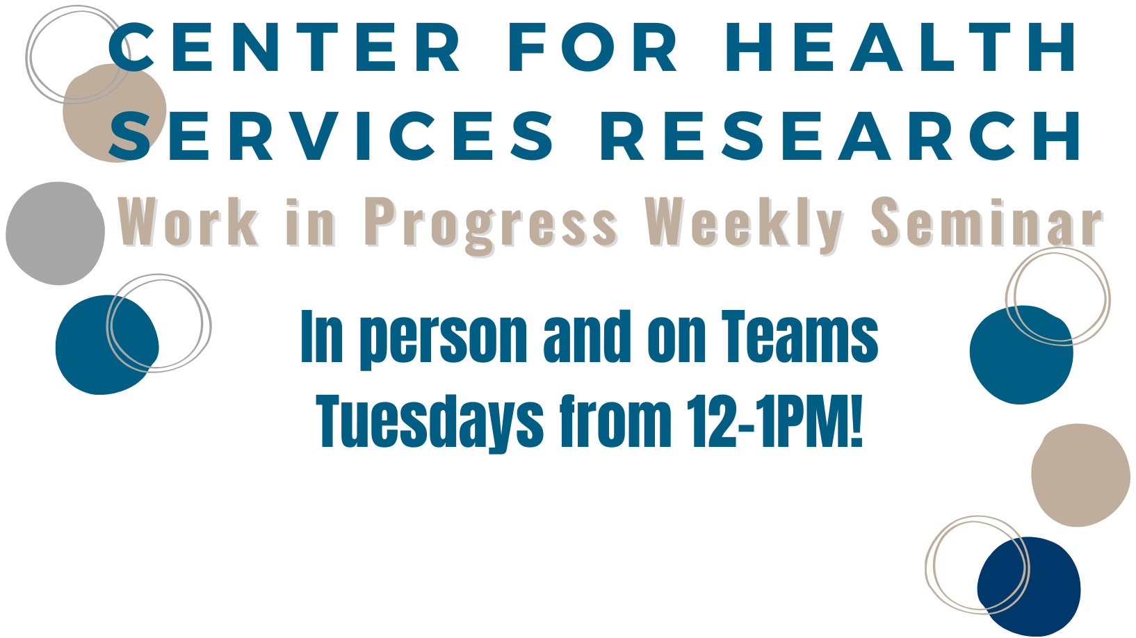 The Center for Health Services Research holds a weekly Work in Progress (WIP) seminar on Tuesdays from 12:00 - 1:00 pm. The seminars format is now hybrid in person and on Teams.
